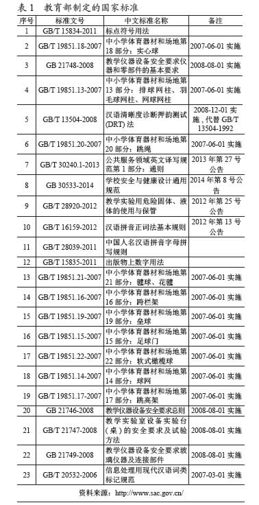 在SAC网站上可以查询到主管部门为教育部(编号360)的国家标准,这些标准开列在表1中。表1中23项标准中属于教育装备的共计14项,其中以中小学体育器材与场地方面的标准为多数,涉及实验室与教学仪器设备的标准只有5项。这5项占教育装备类国家标准(14项)的35.7%,占全部教育类国家标准(23项)的21.7%。在14项教育装备标准中为强制标准的有《教学仪器设备安全要求仪器和零部件的基本要求(GB 21748-2008)》《学校安全与健康设计通用规范(GB 30533-2014)》《教学仪器设备安全要求总则(GB 21746-2008)》以及《教学仪器设备安全要求玻璃仪器及连接部件(GB 21749-2008)》共4项,它们全部都是关于教育装备安全质量的标准,其他大部分则为推荐标准。