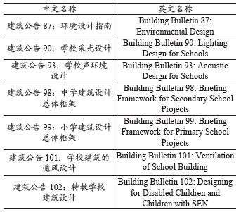 英国中小学校舍、场地建筑设计的依据主要有3个种类的标准:教育部颁布的《学校建筑设计规范》("School Premises Regulations")、国家颁布的《建筑设计规范》("Building Regulations")以及教育部颁布的《建筑公告》("Building Bulletin")。