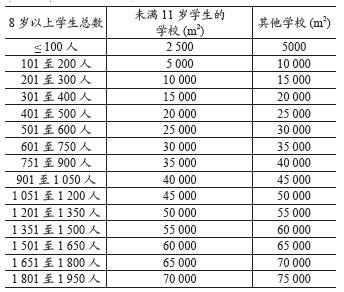 英国中小学校舍、场地标准中也有配备标准的相关内容,现以对学校运动场地面积的要求为例,介绍标准中涉及配备标准的部分。在《教育(学校建筑)设计规范》中,规定了学校运动场地的最小面积与学校规模(学生人数)之间的关系(详见表8)。