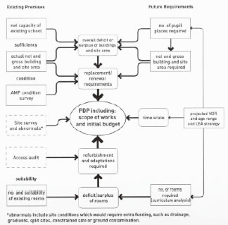 英国中小学校舍、场地的建设不仅全国要有长远的发展规划,每个具体学校的建设也被规定要有战略性目标与方案的设计。例如,在教育部颁布的《建筑公告99:小学建筑设计总体框架》中就有关于校舍建设规划PDP(Premises Development Plan)的具体要求,图3是该标准中的一个截图,它详细而逻辑清晰地对一个建设方案做出了具体规定。图3中的左部是对学校现存建筑情况分析的要求,包括现有学校建筑的净容量、现有建筑面积、现状调查、异常情况、审计情况、现有房间的数量和适用性等问题的分析;右部是对将来需求评估的要求,包括预计学生名额数、预计建筑面积、预计建设和使用时间、项目规范与策略、根据教学所测算的需要房间数等问题的分析;而中部是校舍和场地面积的过剩或盈余、更换/更新要求、总体规划的工程范围和初步预算、翻新和适应要求、教室数量过剩等方面的考虑。整个规划要根据“全寿命周期”理论进行设计,并规定一个校舍、场地建筑比较合理的生命周期为25年至60年[8]。