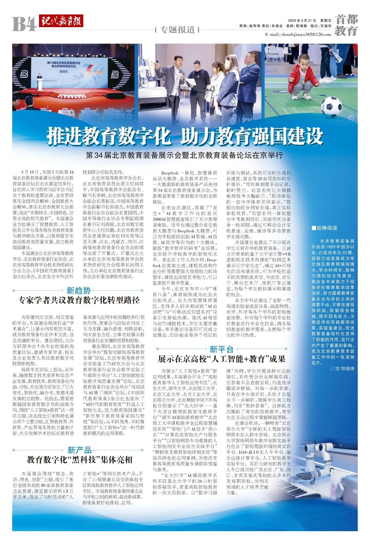 今年,展会继续融合线上线下、直播录播等多元手段,全方位聚焦丰富多样的教育智慧成果,精心组织呈现了“第34届北京教育装备展示会主论坛” “数智化赋能高等教育发展” “AI时代的教育智变”“打造人工智能生态 助力教育强国建设” “新形势下教育装备采购与管理” “当阅读与AI撞了满怀” “人工智能赋能实验教学高质量发展”7场高水平学术论坛,来自教育各界的发言嘉宾达60位,包括来自高校的15位学者、教育行政部门的12位领导、教育研究单位的14位专家、各类中小学校的7位校长,以及民主党派人士、科技精英等,呈现出百家争鸣、百花齐放的学术交流盛景。