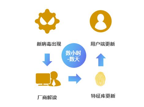 基于特征库的防御手段,对于病毒的防御均会经历:① 新病毒出现② 样本采集 ③ 厂商解读④特征提取⑤ 特征库更-⑥ 用户端更新 ⑦ 病毒检测与查杀,七个步骤。这个周期一般在数小时至数天之间。时效的天然滞后性,在应对频繁变种病毒时效果往往不尽如人意。据CNCERT统计,2018年全年勒索软件 GandCrab更新了19 个版本,且由于勒索病毒性质的特殊性,一旦被感染,即使后续特征库更新,也可能造成无法弥补的损失。
