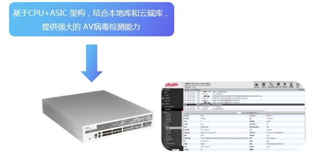 ③ RG-WALL 1600系列下一代防火墙:基于CPU+ASIC架构设计,结合本地库和云端库,提供及时更新的强大AV病毒检测能力。