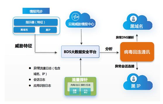 锐捷解决之道:RG-BDS+探针+威胁情报协同,实现对C&C 回连通信、僵尸网络等威胁的检测,发现病毒威胁。