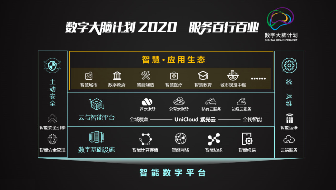 为了与客户携手更好地迎接“智变”时代,新华三隆重发布了全新的“AI in ALL”智能战略,致力于让自身的产品和解决方案更具智能,同时助力客户的业务与运营更智能。在智能战略的引领下,新华三发布了全新升级的“数字大脑计划2020”。2019年首次发布的数字大脑计划,以数字基础设施、业务能力平台、主动安全和统一运维构成的智能数字平台为基础,与生态合作伙伴开展智慧应用领域的创新。在“数字大脑计划2020”中,除了继续将智能技术全面应用于数字基础设施、主动安全及统一运维中之外,更将业务能力平台全面升级为云与智能平台。紫光集团成立了紫光云与智能事业群,将云与数字化业务提升为集团核心战略。整合私有云、公有云、人工智能、视频云、软件服务能力,实现技术、品牌、市场、服务全面统一,以全新打造的“紫光云”品牌面向市场,致力于成为智能时代百行百业数字化转型的最佳合伙人。以新面貌登场的“紫光云“将提供公有云、私有云、边缘云以及多云服务的全域覆盖能力,满足市场多元化的需求,同时把智能化技术全面应用到数字中台、数据引擎、安全服务、视觉能力平台等,以全栈智能、全域覆盖和全场景应用赋能百行百业的数字化和智能化。