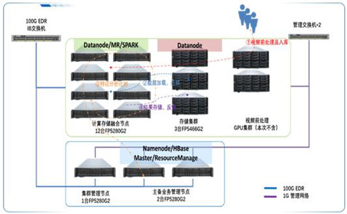 值得一提的是,该大数据平台解决方案对计算及存储资源采用了分层、分区设计,针对在线数据分析计算过程对内存容量、存储IO带宽有较高要求,采用计算存储融合模式,配备12台浪潮IPS FP5280G2节点,既作为计算分析节点,同时也作为高速HDFS(SSD)存储节点,提供23TB可用存储空间,可对15个左右的铁塔1天的视频数据进行在线分析。针对大容量数据的存储需求,配备3台浪潮IPS FP5466G2分布式存储节点,构建海量存储空间,为SPARK,MR,HBASE提供不低于192TB存储空间,可以与在线数据间实现分级存储,同时采用双口100G网络,为数据访问提供20GB/s的前端接口,防止数据瓶颈。利用HDFS分层策略,保证数据主副本在计算存储融合节点SSD高速存储HDFS空间,其他副本在存储节点提供大容量HDFS空间,并根据SSD使用率自动完成数据向后端迁移。