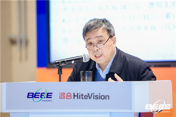 副会长单位北京市东城区教育技术装备中心主任崔保民以“回归原点再出发”为题进行发言,他提到自己对教育装备行业在疫情三年的磨练下产生了许多思考,并认为教育装备行业想要在当下时代转轨就要找到自己的原点,即初心不变。崔保民副会长提出,教育现代化建立在教育技术装备现代化基础之上,教育装备行业面对挑战的当下也是迎接机遇的未来。