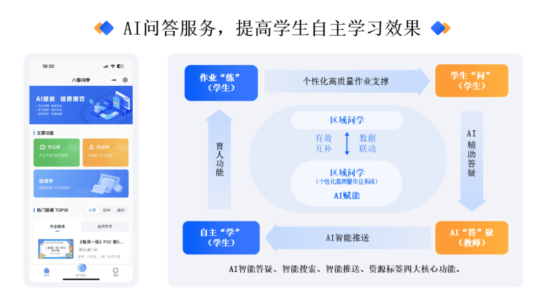 金华市武义县明招小学是一所拥有百年历史的学校,大量外来务工子女在这里接受教育。学生在日常作业中,不可避免会产生大量疑问,但大多时候难以解决,很多家长没时间也没能力辅导孩子。同时,学生周末或假期提问,老师逐一答疑负担较重,也存在针对性不足等问题。在这样的背景下,明招小学通过“八婺问学”平台开创性地将“学生问一老师答”的课后场景,拓展为“作业练一学生问一老师答一学生学”的“课前 + 课中 + 课后”场景闭环。