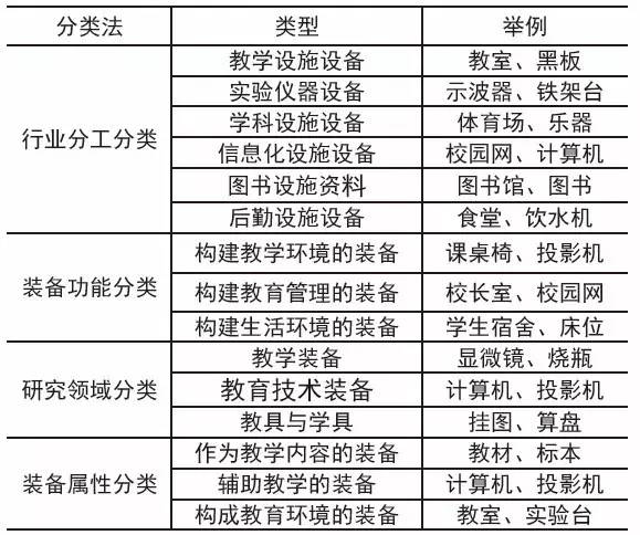 笔者在本刊发表的《教育装备元标准建立的必要性》一文中对教育装备分类做了较为深入的讨论,文章提出了教育装备具有行业分工分类、装备功能分类、研究领域分类以及装备属性分类4个分类方法(见表1)。该文为了充分说明教育装备元标准建立的必要性而特别强调指出了装备属性进行分类法的作用,即作为教学内容、辅助教学、构成教育环境装备的特点及其作用。而在本文所讨论的问题中,则是采用了装备功能分类法的分类。