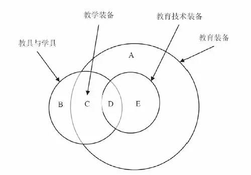 从教学系统三分论的角度分析,辅助认知功能类的教育装备起着知识载体的作用,是将教学系统中的客体——知识(含隐性知识)传递到系统的主体——学生端的工具,反映到图1中就是C,D,E三个区域。图中B区所限定的事物为非人工制造,所以不属于装备,当然也就不属于教育装备;A区所规定的事物则属于环境优化功能类和教育管理功能类教育装备。