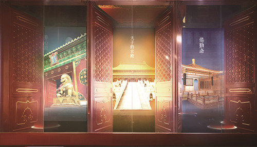 在端门城楼展厅中,大厅两侧的巨幅通景画均为12 m×3.5 m。在不透明时,游人仿佛身临其境陷入画中风景;而透明时,游人竟能透过画面看到通景画背面的立柱。其中一侧的通景画在相邻的5对门板之间,仿佛是推开门看到了门外的紫禁城风光,但每一对门板中的风景竟然大不相同。另一侧的通景画中,明亮绚丽的色彩将金銮殿逼真地呈现在超宽大屏上,仿佛大殿就在眼前。