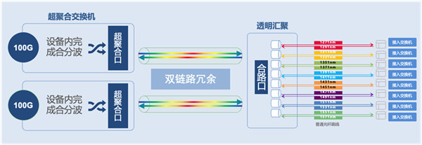 同时,以太彩光技术下的极简光方案整体采用了大二层架构,以无源透明汇聚替代原楼栋有源汇聚,真正实现了汇聚节点无源,弱电间零维护;而且通过波分技术和交换机融合,提升了核心端口密集程度和总接口数量,核心侧采用超融合模块,单个端口下联一根光纤就可实现8个入室交换机接入。将原来核心侧的8个光口,替换成现有一个超聚合模块,大幅度降低了核心侧端口占用数、跳线数量,部署方式更加简约,运维工作更加轻量。