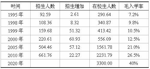 高等教育从1999年开始“扩招”,之后经历了快速的发展,普通高等教育本专科在校生规模2010年比1998年扩大了555%,而同期GDP增长为386%。表1为近15年我国普通高等教育规模统计数据[1]。