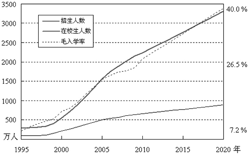 我国高等教育规模发展曲线如图1所示,其中未来数据根据国务院颁布的《国家中长期教育改革和发展规划纲要(2010-2020年)》[2]测算。从图1可以看出,过去10年高等教育规模发展较快,未来10年虽然发展速度放缓,但在校生人数任将保持稳定增加。