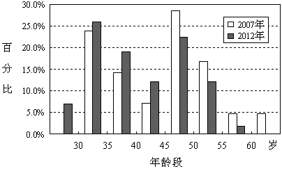 我院5年前有专任教师42人,其中专职实验教师11人,其余为理论课教师兼任实践教学。当时平均年龄39.45岁,各年龄段人数比例如图2所示,为便于对比,图中年龄段已折算成2012年的年龄。可见当时年龄结构很不均匀,50%集中在30~35岁和45~50岁这两个年龄段。五年来,退休3人、调离1人,新进20人。现有实践教学教师58人,专职实验员10人。平均年龄40.57岁。注意了不同年龄段师资人员的增加,特别是加强了有实践经验的中青年人才的引进。从图2对比可以看到:年龄结构更趋于均匀合理。