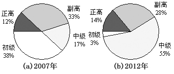 从职称结构分析,我院2007年实践教学师资职称结构比例如图3(a)所示,基本呈“金字塔”状结构,但中级职称人数比例过低。5年后,职称比例如图3(b)所示,中级以上职称人数结构较好,但初级职称人数过少。此为受学校进人政策影响所致(如图3所示)。初级职称师资偏少,使得日常基础性、事务性工作缺乏人手,不利于实践教学的正常进行。