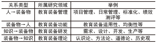 教育装备的研究对象是教育教学系统中的装备物,但是对它的研究应该是“见人见物”的,即研究内容必须是构成教育教学系统中的人、知识、装备物之间的和谐关系。于是便产生了4种类型的研究内容:一是人对装备物的关系;二是装备物对人的关系;三是知识对装备物的关系;四是装备物对知识的关系。这些关系及相关的研究内容开列在表1中。