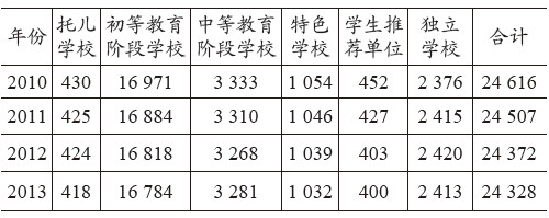 表1 2010-2013年英国基础教育阶段学校数量统计情况 单位:所