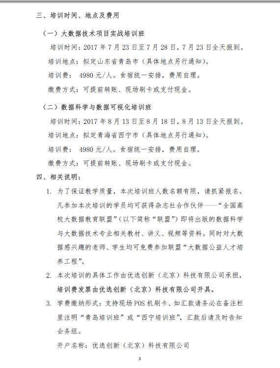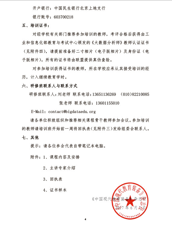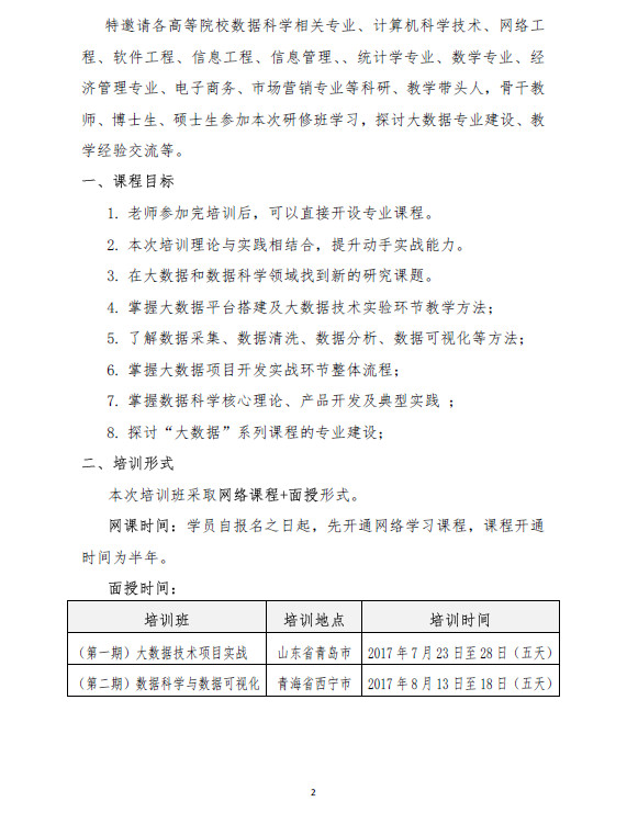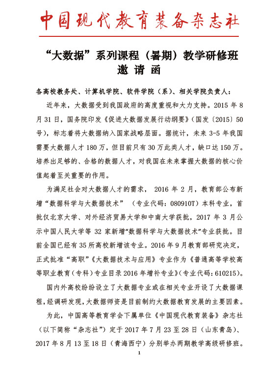[导读]《中国现代教育装备》杂志社(以下简称“杂志社”)定于2017年7月23至28日(山东青岛)、2017年8月13至18日(青海西宁)分别举办两期“大数据”系列课程(暑期)教学研修班
