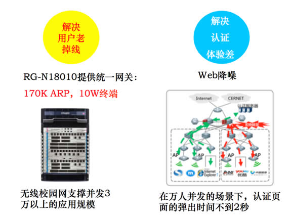 RG-N18010系列交换机不但是无线网的核心,同时可以把所有有线用户的网关上收,并启用集中式的Portal认证,结合web降噪、无感知认证、跨厂商无缝漫游等技术,页面弹出时间为毫秒级别,给全校师生带来超爽的网络使用体验。
