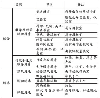 教育装备配备标准是作为学校教育教学必要条件的规定,是对学校构成学生学习环境、学校生活环境、教师工作环境、学生活动环境等条件的基本要求。配备标准一般是对教育装备种类与数量的规定,中小学校舍、场地配备标准的指标规定与学校的规模(学生人数)有关,与学校学制(小学、初中或高中)有关,与学校地域属性(城市、乡镇或农村)有关。表1开列了中小学校舍、场地配备标准规定的部分条件基本要求项目;表2开列了配备标准对学校规模的规定实例;表3开列了配备标准对教室数量的规定。