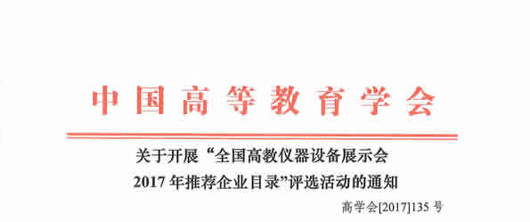 经教育部批准,由中国高等教育学会主办、国药励展展览有限责任公司承办的第50届全国高教仪器设备展示会将于2017年11月2-4日在南京举行。为宣传优质高等教育装备企业,提高教育装备产品质量,对充分利用全国高教仪器设备展示会平台积极参与仪器设备展示、发挥现代仪器设备对高等教育领域支持作用的企业进行推广,为高校招投标提供辅助参考数据,全国高教仪器设备展示会组委会将开展“2017年推荐企业目录”评选活动,并由《中国现代教育装备》杂志社印发“全国高教仪器设备展示会推荐企业目录”(专刊)。