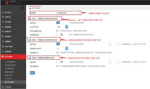 针对此标准,烽火台治理平台通过智能算法,结合大数据相关进行自动化僵尸网站梳理,自动的完成网站资产普查与安全合规检测。我们只需配置一步即可完成僵尸系统识别。