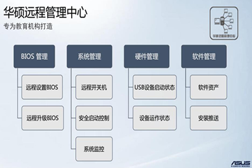 在BIOS管理、系统管理、硬件管理、软件管理这四大管理方面,华硕远程管理中心软件(ACC-ASUS Control Center)做得可谓相当周到。其中,它的BIOS管理非常的方便,包括远程设置BIOS以及远程升级BIOS,且所有华硕行业专供CSM主板均支持定制专属的BIOS,例如专属开机LOGO画面、专属客制化固件信息等。它的系统管理包括了远程开关机、安全启动控制、系统监控。硬件管理包括了USB设备启动状态管理、设备运行状态管理。软件管理包括了软件资产管理以及安装推送管理。
