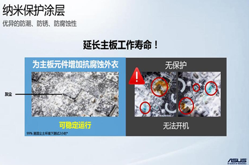 此外,华硕行业专供CSM主板并采用黑科技纳米保护涂层,可有效防潮、防锈、防腐蚀,极大延长了主板工作寿命;拥有五重防护,包含增强型ESD静电防护、防电涌、过压保护、稳定供电、过流防护和不锈钢防潮I/O接口,提供硬件级安全防护,多方位防护保证主板的质量与长期耐用性;此外,在温度高达 45°C、湿度高达 80% 的条件下,经过严苛的168小时7×24压力测试,确保主板在高温高湿环境下也能稳定运行。