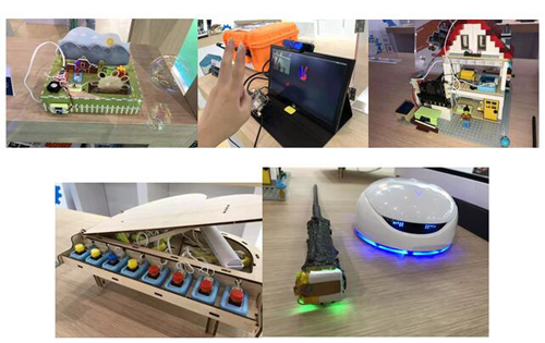 除创客教育套件外,此次蘑菇云创客教育还为大家展示了基于创客教育套件制作的创意小发明,如基于boson模块制作的泡泡机、智能生活屋和钢琴,基于“拿铁熊猫”(LattePanda)的面部/手势识别,用魔法棒操控的Vortex机器人等等。