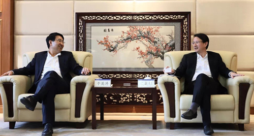 浙江大学校长吴朝晖(图右)与紫光股份董事长兼新华三首席执行官于英涛(图左)亲切会谈