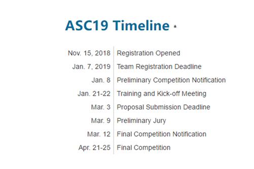 ASC19继续采用“初赛+决赛”的赛制。2018年11月15日到2019年1月7日为高校报名阶段,以小组形式报名,每个参赛队伍由五名本科生和一名指导老师组成。2019年1-3月为初赛阶段,参赛队根据要求提交超算应用优化提案,组委会筛选出二十支队伍进入决赛。决赛将于4月21-25日在大连理工大学举行,参赛队基于大赛提供的硬件平台,在3000W功率下设计和搭建超算集群并实现指定应用的优化。