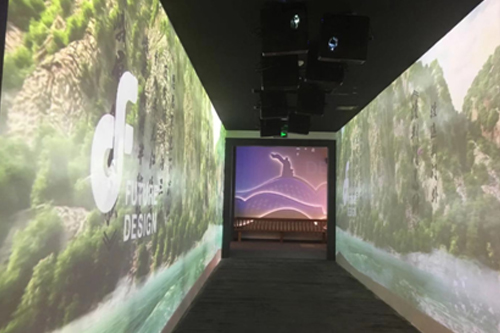 走进诗歌意境廊道,NEC CU4200WD HLD光源投影呈现双侧廊道投影,4200lm的高亮度以及3*11米的巨幅投影使游客仿佛进入了“陇西映日彩霞涌,粉竹千年茂而幽,罗汉仙洞堪避暑”的诗画意境中,NEC在左右两面墙面各做了投影竖投融合,打造出栩栩如生的秀丽景观,让我们对历史有了新的认知和感悟。CU4200WD运用全新的HLD与液晶技术的有机结合,大大提升了投影机的色彩表现力,才让观众有了更加沉浸式的体验感。