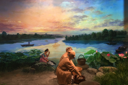 在“浣纱得鲤”的场馆中,通过CU4200WD 天花板隐藏安装进行融合投影,将日升日落,朝阳晚霞呈现的层次分明、淋漓尽致,生动再现了当时“浣纱得鲤”妇人洗衣的生活场景。李白的生平场景被投影机用这样的方式演绎出来,让游客仿佛置身其中,感受到一个更加鲜活的李白形象。