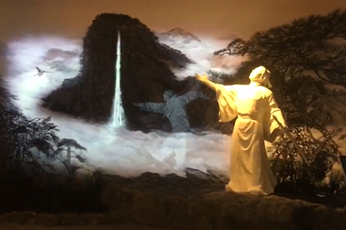 当然了,一生创作了无数佳作的李白,诗歌里的场景更是表达了其对生活的感悟,对环境的赞美,对未来的向往,NEC CU4200WD 背景展示人物动态影像,投射出了诗仙在山脚下剑舞的豪气场景,高达20000:1超高对比度使暗景细节丰富,云雾缭绕的仙气、挺拔苍劲的松柏,清晰的投射画面为我们呈现了一幅“飞剑决浮云,诸侯尽西来”的霸气景象。